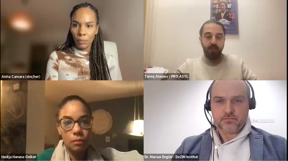 Aktuelle Entwicklungen in der Migrationspolitik und wie wir über Migration sprechen" mit Tareq Alaows, Marcus Engler, Hadija Haruna-Oelker und Aisha Camara.